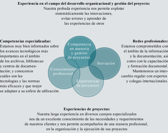 Nuestras numerosas actividades de gestión de proyectos y dirección de centros de documentación nos han permitido obtener una vasta experiencia en organización y gestión de servicios de información. En el transcurso de nuestra trayectoria profesional, hemos dedicado muchos años a trabajar con archivos, bibliotecas y centros de documentación.